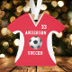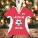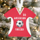 Equipo Deportivo Uniforme de Jersey Ornamento Rojo. Este adorno de una camiseta de fútbol es perfecto para cualquiera que juegue deportes escolares o ame ver deportes. Personalice este diseño personalizado con su propio nombre de equipo y número jersey.