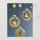 Adornos y bolas de Navidad dorados y rojos están elegantemente colgados con cintas, creando una exhibición festiva y refinada de decoración navideña contra un fondo azul oscuro con copos de nieve sutiles.