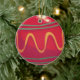 Ilustración vintage diseño de fiesta navideña Merry Christmas con adornos colgantes redondos de vidrio rojos y verdes. Están decorados con remolinos decorativos amarillos, rayas y formas de diamante. Kitsch retro clásico de los 50.