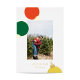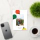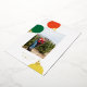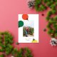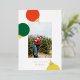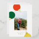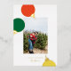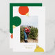 Un diseño moderno de tarjeta de vacaciones con 3 adornos de estilo retro en rojo, verde y amarillo rodeando una foto personalizada sobre un saludo y firma personalizados de la temporada.