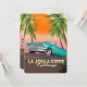 Afiche de viaje de La Jolla Cove California con un hermoso auto retro viejo, junto a altas palmeras balanceantes.