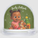 Celebrate a baby girl’s first Christmas with this adorable personalized snow globe. Featuring a cute African American baby holding a festive ornament with her puppy, surrounded by holiday decorations. Add her name to create a treasured keepsake for years to come. Perfect gift for new parents, baby showers, and holiday celebrations.