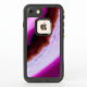 Una colorida fotografía de piedra gemela retroiluminada de una ágata púrpura con una línea de cuarzo blanco recorriendo ella.
