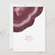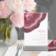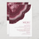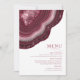 No todos los diseños bodas se crean iguales. Los diseños asimétricos de las piezas en este conjunto impactante de bodas demuestran que eso no es malo. Bandas onduladas de color en tonos de burdeos a rosa suave y gris con un centro de cristal brillante forman un acento geodésico/agato en la mayoría de las piezas del conjunto. La tarjeta "Menú" del boda que se muestra aquí incluye lo anterior más una plantilla para añadir las selecciones de menú boda correspondientes. Al revés también se puede añadir el nombre de la novia y del novio y la fecha del boda. Buscar ID647 para ver todas las piezas de coordinación de este conjunto.