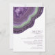 No todos los diseños bodas se crean iguales. Los diseños asimétricos de las piezas en este conjunto impactante de bodas demuestran que eso no es malo. Bandas onduladas de color en contrastantes tonos violeta y verde con un centro de cristal brillante forman un acento geodésico/agato en la mayoría de las piezas del conjunto. La tarjeta "Menú" del boda que se muestra aquí incluye lo anterior más una plantilla para añadir las selecciones de menú boda correspondientes. Al revés también se puede añadir el nombre de la novia y del novio y la fecha del boda. Buscar ID647 para ver todas las piezas de coordinación de este conjunto.