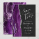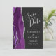 El borde izquierdo de esta elegante y moderna boda, salvo la tarjeta de fecha, cuenta con un borde de batido color morado con purpurina de imitación plateado. El texto del personalizable combina la escritura a mano gris plateado, el copperplate y las fuentes cursivas en un fondo negro de pizarra. En la parte posterior aparece un diseño de agate morado y plateado.