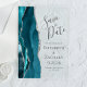 El borde izquierdo de esta elegante y moderna boda, salvo la tarjeta de fecha, cuenta con una verde azulada barra de acuarela azul recortada con purpurina de imitación plateado. El texto del personalizable combina la escritura a mano de carbón gris, el copperplate y las fuentes cursivas en un fondo transparente claro.