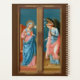 ℣. El Ángel del Señor le declaró a María, ℟. Y ella concibió el Espíritu Santo". Así, comienza la oración de tres días de Angelus a la Santísima Virgen María (BVM) que conmemora la encarnación en la Anunciación. + La Anunciación fue un tema inmensamente popular en el arte de la Edad Media y el Renacimiento. Como composición de dos personas, el sujeto se prestó a su uso en las hojas exteriores de los triptillos: el ángel de una hoja; Mary, por la otra. Un tríptico es una obra de arte —la mayoría de las veces una pintura de panel— que consiste de tres partes unidas de tal manera que se puede mostrar abierta o doblada cerrada. + Aquí, Filippo Lippi (1406-1469) ha pintado la Anunciación a temperatura sobre madera en rosados cálidos, salmones y rojos y en blues brillante y oscuro. Ambas figuras se encuentran en sus estrechos espacios respectivos, el Arcángel Gabriel inclinándose un poco ante la dulce y dulcemente destacada doncella María. A + Saints_Ainfinito le gusta el fondo marrón oscuro de esta imagen. Un fondo marrón oscuro da a los espectadores la impresión de que son espectadores observando la escena a través de una ventana. Pero, como de costumbre, hemos proporcionado una postal de la Paleta de Color para otros tonos sugeridos. + Fiesta de la Anunciación: 25 de marzo; Fiesta de San Gabriel el Arcángel: 29 de septiembre + Crédito de la imagen (M 038): Imagen antigua de la Anunciación de Filippo Lippi (1406-1469) de una postal de finales del siglo XIX y principios del siglo XX publicada originalmente por cromolitografía E. Sborgi, Florencia, Italia, de la colección privada de ephemera religiosa del diseñador. Los paneles originales de un poliptílico de origen desconocido se encuentran en la sala Filippo y Filippino de la Galería Uffizi en Florencia. La Anunciación forma las mitades superiores de las dos hojas mientras que SS. Anthony Abbott y John el Bautista aparecen en la parte inferior izquierda y en la parte inferior derecha, respectivamente.