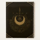 Armonía de los elementos: luna, oro y geometría. Donde los secretos del universo se esconden, una luna creciente surge con una superficie que refleja la luz de las estrellas en un resplandor dorado. La luna se sienta majestuosamente en un marco circular que actúa como un círculo protector, mientras que las líneas doradas fluyen desde su centro como rayos de luz solar, penetrando la oscuridad. El fondo negro profundo realza el contraste con los brillantes elementos dorados y crea una atmósfera de misticismo
