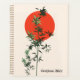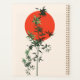 Un par de tallos de bambú verde con hojas se paran contra un sol rojo que se levanta sobre un fondo pergamino de color marrón pálido.
