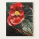 Una pintura acuarela hecha por el artista Jodi Mahaffey de una sola flor rojiza brillante de Begonia contra un fondo de hoja oscura le da a esta pieza un ambiente vibrante y amoroso.