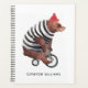 Este diseño presenta un ilustracion acuarela de un oso en una bicicleta con un suéter rayado y un gorra rojo.