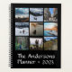 Este planificador personalizado anual presenta un fondo de color sólido con un diseño de nueve rejillas de fotos, nombre de familia y el año en la portada. Incluye información general mensual, planes semanales y una página de pegatinas planificadores. Disponible en dos tamaños, tapa dura brillante o cubierta dura satinada, y su elección del color de la columna de la espiral de alambre en blanco, negro u oro.