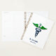 Interpretación moderna del emblema caduceus clásico con barra y serpientes de color azul metálico, alas estilizadas verdes y placa de vidrio redonda con símbolo de cruz verde. Este atractivo y profesional diseño es perfecto para médicos, profesionales médicos, clínicas o cualquier persona que trabaje en la salud. Personalizable con su propio nombre, título e información de contacto.