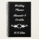 Este impresionante planificador de bodas presenta una imagen de arte digital de un par de hermosos escorpiones blancos que se enfrentan entre sí. Cada escorpión es blanco y tiene ocho patas, una picadura venenosa y un par de pinzas. Las pinzas se mantienen juntas para formar la forma de un corazón. El fondo es negro. Un hermoso diseño de Boda gótico. Hay un texto personalizado para que puedas incluir los nombres de la pareja feliz y la fecha Boda.