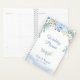 Esta portada de este planificador nupcial de cuaderno tiene un borde superior de imágenes de flores azules, melocotones y amarillas pálidas enclavadas en una suave vegetación. El texto de su personalizado es azul en el centro sobre un fondo blanco. Una segunda imagen floral coincidente separa el campo de texto superior de los dos campos de texto inferior. El fondo del planificador tiene una sutil acuarela azul. La parte posterior del planificador tiene una repetición de la imagen floral más pequeña. *Este diseño utiliza obras de arte de LABFcreations.