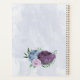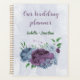 Hermoso planificador de bodas románticas con flores azules polvorientas y púrpuras y algunas hojas verdes.