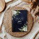 Una debe tener cuando planee a su boda. Azul marino, fondo texturado con una capa de bandeja de oro rosa moteada. Dos hermosos ramos antiguos, chic y sobriamente, de rosa blanca en las esquinas, una superior izquierda y otra inferior derecha. Este moderno diseño presenta un ambiente rústico de moda boho.