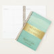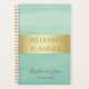 Sencillo y elegante planificador de bodas verde acuarela con detalles de Relieve metalizado dorado amarillo y nombres de pareja, para novias modernas.