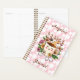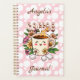 Portátil personalizado. Una taza linda de café Kawaii, cubos de azúcar y flores rosas con un tipo de letra vintage que dice "café". Rosa, beige y verde sabio.