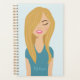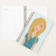 Este planificador presenta el ilustracion personalizado de Destei de un hermoso chica que tiene el pelo rubio largo que es muy voluminoso. Un ojo está cubierto de su pelo mientras que el otro está cerrado. La chica lleva una camisa de color azul y sus labios son rosados. Hay un área de texto personalizable para un nombre que va por encima de la camisa.