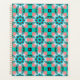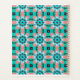 This design features a mesmerizing, intricate geometric lattice pattern reminiscent of Moroccan tiles, modern kaleidoscopes, or Mediterranean mosaics. The vibrant color palette combines refreshing Aqua/Teal, Coral Pink/Salmon, deep Navy Blue/Black, and touches of rich Red, creating a bold, lively, and sophisticated look.
