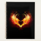 Ángel dispara el corazón con las alas flameantes sobre fondo negro.