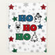 Diseño de Navidades Ho-Ho-Ho con copas de nieve, muñeco de nieve, árbol de Navidad, reno y estrellas de colores decorando fondo blanco