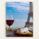 Dos copas de vino tinto con tentempiés con vistas a París y la Torre Eiffel. Vidrio de vino tinto con diferentes tentempiés - plato con jamón, rebanado, queso azul. Pareja, celebración romántica. Cafetería con vistas.