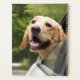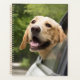 Domingo a través del país, en un camino de tierra arbolado con labrador recuperever. El perro tiene la cabeza por la ventana y parece feliz de ir a dar un paseo y parece estar sonriendo.