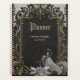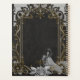 Elegancia en plata y negro. Esta imagen presenta un ilustracion en blanco y negro de un marco boda con intrincados adornos de oro y plata. El marco está decorado con motivos florales ornamentales y una arcada central. Una novia en un vestido de flores, sosteniendo un ramo de flores, se para dentro del marco, mirando lejos del espectador. El fondo es una superficie negra texturada que crea una atmósfera dramática y elegante.