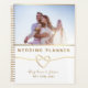 Simple, minimalista, moderno, elegante planificador de boda blanco con corazón de cuerda dorada romántica y foto.