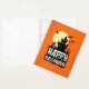 Feliz ilustracion de diseño de texto de Halloween con decoración de casa embrujada, cementerio y murciélagos en luna llena sobre fondo naranja de grano