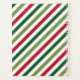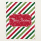 Feliz ilustracion navideño con texto y diseño de copos de nieve sobre fondo rayado rojo, blanco y verde