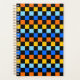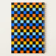 A vibrant checkerboard pattern featuring alternating rows of orange, yellow, light blue, and blue squares against a black background. The design is bold and energetic.