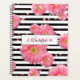 Hermoso diseño de planner espiral personalizado con flores Gerbera rosadas en un patrón rayado en blanco y negro. El texto es totalmente personalizable.