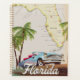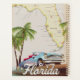 Hermoso mapa ilustrado del estado de Florida y las islas de la región en un hermoso estilo vintage con un auto retro de los años 50.