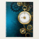 fondo turquesa, texturado, de vapor punk con bronce y oro, llave de plata y reloj. Estilo Steampunk.