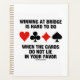No importa cuán a menudo o cuán poco juegues el juego del puente, si eres un jugador de bridge, disfrutarás de este irónico truismo que dice "Ganar en el puente es difícil de hacer cuando las cartas no mienten a tu favor", junto con los cuatro palos de cartas. ¡Haz que otros hagan una doble toma en la dificultad número uno de ganar en bridge (puente duplicado) con este memorable humor de puente diciendo planificador!