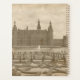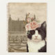 Foto de fondo de color sepia vintage de un castillo con jardines manicurados y superposición de un bonito gato elegante, negro y blanco, con corona florida