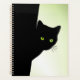 El gato negro pálido con ojos verde esmeralda mira desde detrás de la pared negra hacia una sala verde.