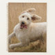 Goldendoodle, lengua fuera, orejas flameando, corre por la hierba alta.