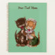 Este planificador es verde menta con un gato amarillo sonriente vestido con un gorra blanco que da ratas de su canasta de madera a su amigo del gato macho marrón. Personalizar el texto en la parte delantera con la plantilla.