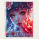 Anime, planificador personalizado. Un bonito chica con ojos rosados, flores y notas musicales, arte brillante. Platos florales morados y rosas.