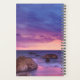 Planificador anual con una hermosa fotografía con llamativos colores de morado, azul y rosa al atardecer. Una línea costera de bonito con rocas.
