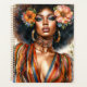 Este colorido planificador presenta un vibrante ilustracion acuarela de una hermosa mujer negra con un lujoso afro que viste la moda vintage de los años 70. Tiene flores en su pelo grueso y lleva grandes aretes de aros dorados y un intrincado estrangulador. Obra de arte floral de estilo retro de una belleza afroamericana rica en melaninas u otra belleza de la diáspora. Perfecto para los fanáticos de audaces miradas de retroceso y orgullo cultural afrocéntrico.