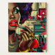 Arte de Guay ai que representa a una colorida mujer afroamericana de estilo cómico que se pone un lápiz de labios en la cocina, mujer de color al estilo retro.