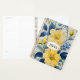 Hermosas flores amarillas y azules cubren este planificador. Luminoso y alegre, con un aspecto de país francés. Una insignia dorada ornamentada con un centro de crema tiene espacio para el año en curso.