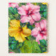 Tropical hibiscus and leaves weekly planner. Personalize this pretty, spiral bound book with a name on the front, or other text. Use one or two lines. Pink and yellow hibiscus flowers, along with big green jungle leaves, cover the front and back of planners in two size, 5x8 or 8x11. Makes a nice gift for a bride planning a wedding, or bridesmaids as thank-you gifts.