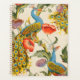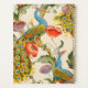 Postal de ilustraciones de pavo real y cachorros. Patrón colorido vintage con pavos reales azules y adornos rojos y morados.